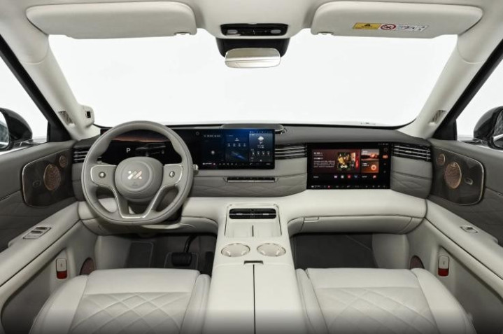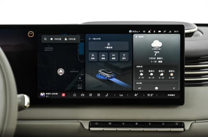 座舱内部,新车采用了和新款智己LS6基本一致的座舱布局,提供深灰色和浅色内饰两种方案可选,车门处带有木纹装饰,辅以金属扬声器罩的点缀,提升了座舱的精致档次感。此外,新车还配备了27.1英寸驾舱屏,其中包含液晶仪表和中控屏,结合15.6英寸副驾驶娱乐屏来看,前排屏幕有效覆盖了主驾驶和副驾驶乘员的车机交互需求。车机内置骁龙8295P座舱芯片,支持CarPlay/Carlink/HiCar车机互联映射、多音区自然语音交互等功能,并提供HUD抬头显示、360°全景影像、AI越野补盲,就座舱的沉浸式科技感而言,不逊于竞品车型。